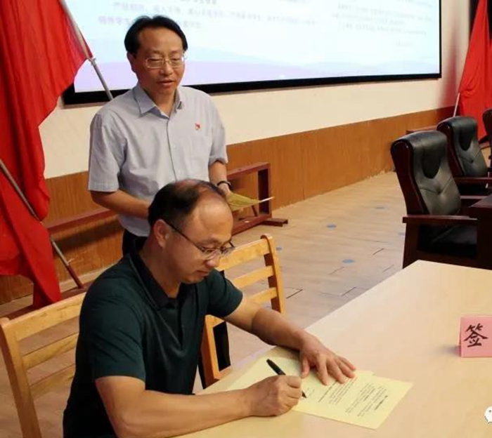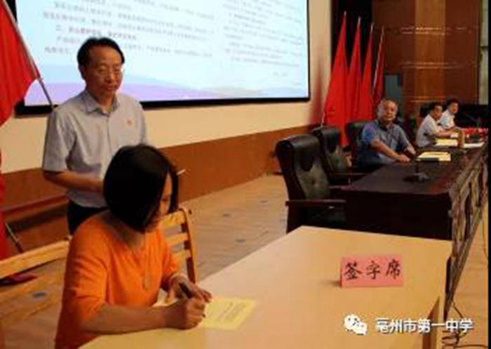 由于学校教职工人数较多,承诺书的签订采用了会上会下相结合的方式进行。会上,在校党委书记、校长王占峰的监督下五位教职工代表郑重签下了承诺书。仵保峰要求其余400多位教职工分年级组、处室进行签字,确保承诺书签字无死角、全覆盖。